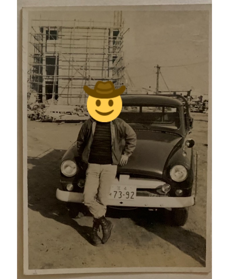 a picture of my father in his youth, standing beside a car.
